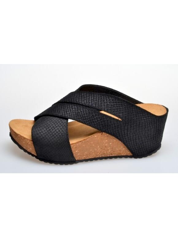 Copenhagen shoes Paris sandal i sort snake præget skind. Sandalen har plateau kilehæl på ca. 6 cm og stødabsorberende indlæg i sålen. Lidt stor i størrelsen. Passer godt til en lidt bred fod. (Læs mere)