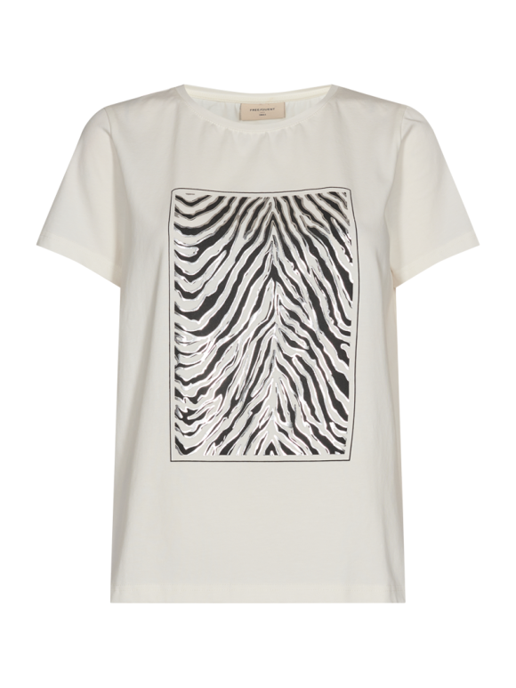 Freequent Nola t-shirt med zebra folie print på forstykket. Rund hals og korte ærmer. T-shirten er regulær i faconen, og har god længde. Offwhite med zebra folie i sort og sølv. 95 % bomuld og 5 % elastan. Vask ved 30 grader. (Læs mere)