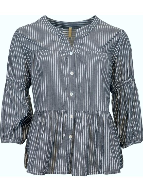 Ofelia skjorte/bluse med trekvart ærmer med elastik og peplum flæser. Skjorten er med rund hals, lille V-udskæring og knapper helevejen ned foran. Jeans blå med smalle hvide lodrette striber. 100 % bomuld. Vask ved 30 grader. Max krymp 5 %. (Læs mere)