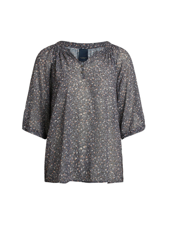 One Two Luxzuz Ranva bluse med rund hals med stolpelukning og knapper ned foran. Korte ærmer. Chiffon kvalitet i grå med småt mønster i hvid,rosa og mørkgrå. 100 % polyester. vask ved 40 grader. (Læs mere)